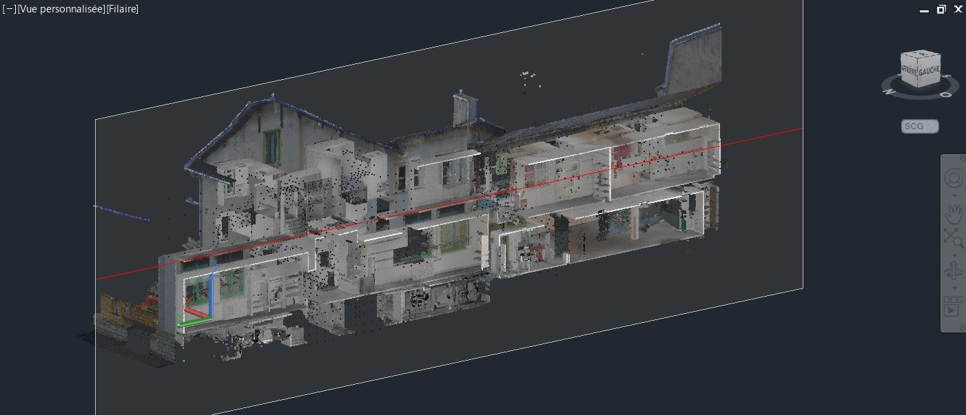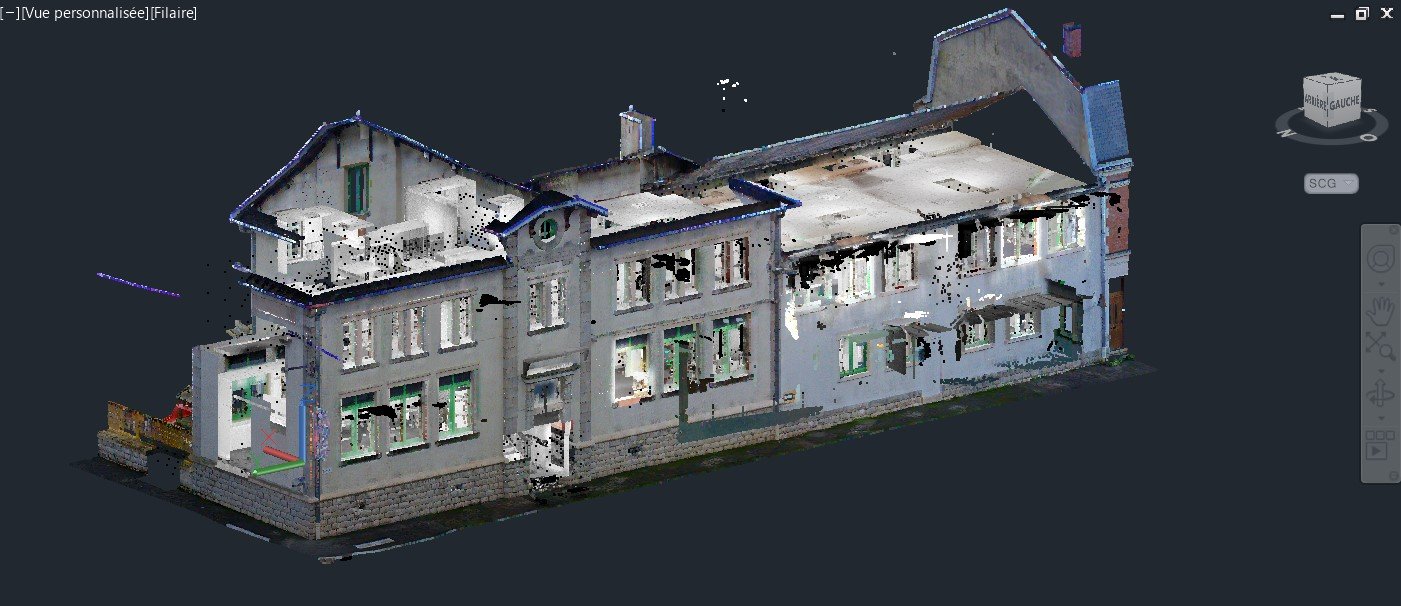 Dans le cadre de ces projets, un relevé en nuage de points a été réalisé par Renaud Cartot entreprise RC-SCAN CONTROL afin de produire des plans 2D précis et détaillés. Cette technologie de scan 3D permet de capturer chaque élément du bâtiment avec une grande exactitude, garantissant une retranscription fidèle des volumes et des structures existantes.