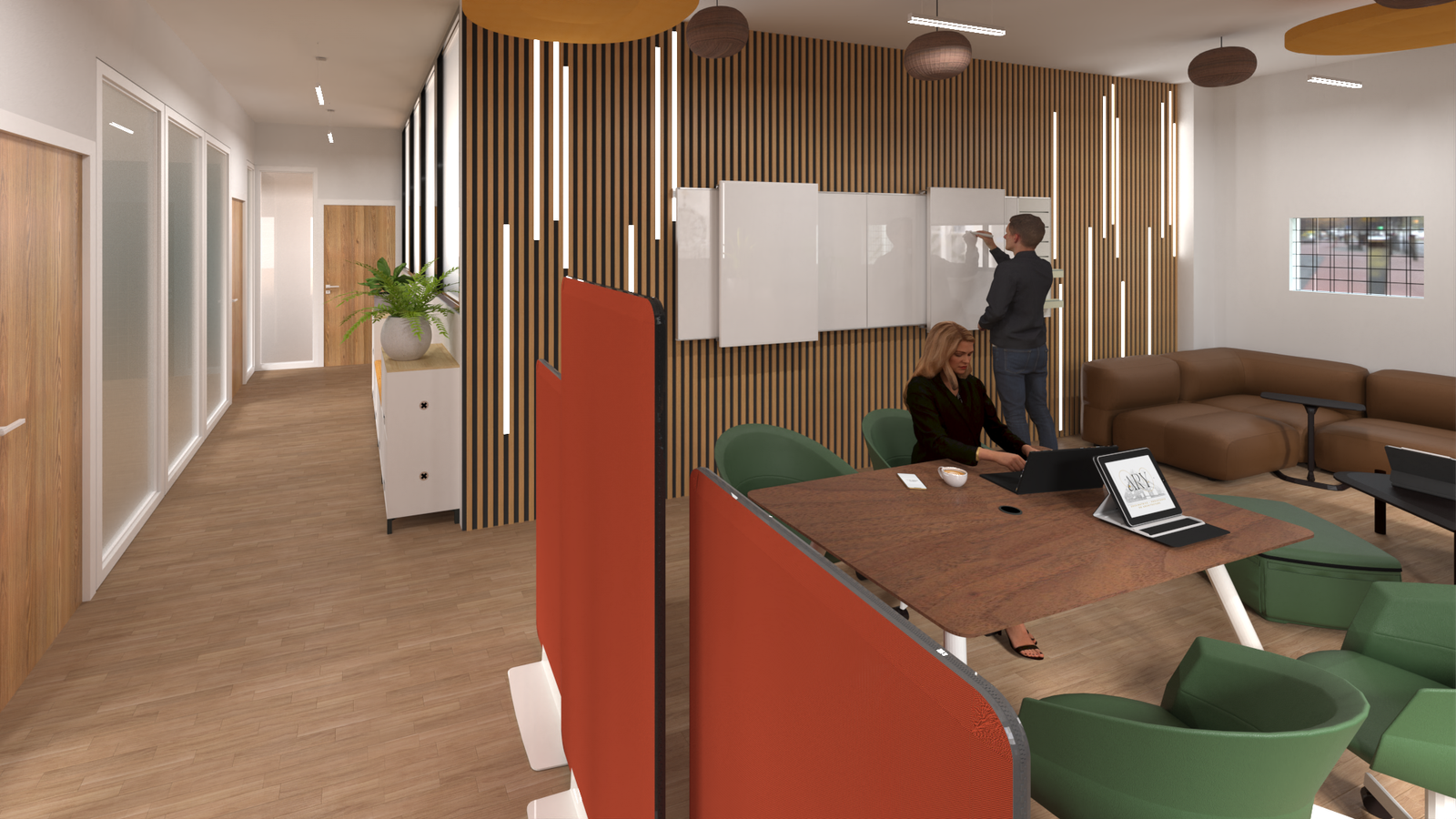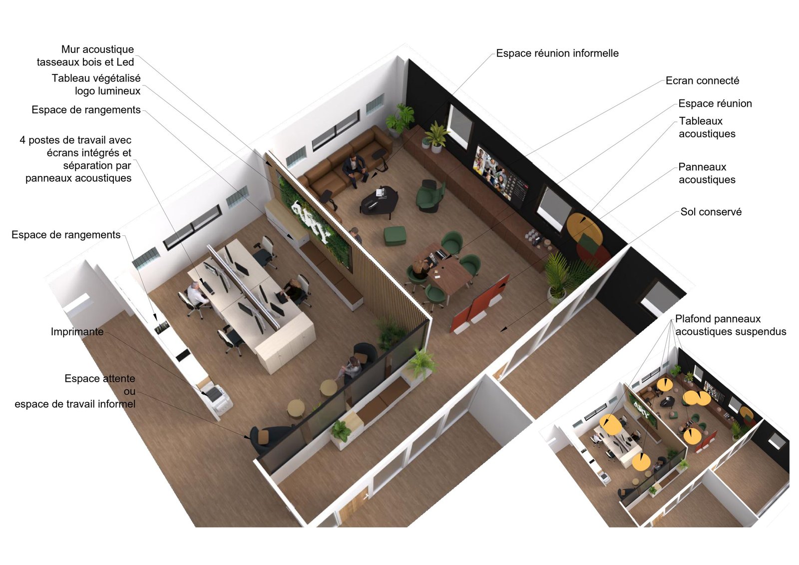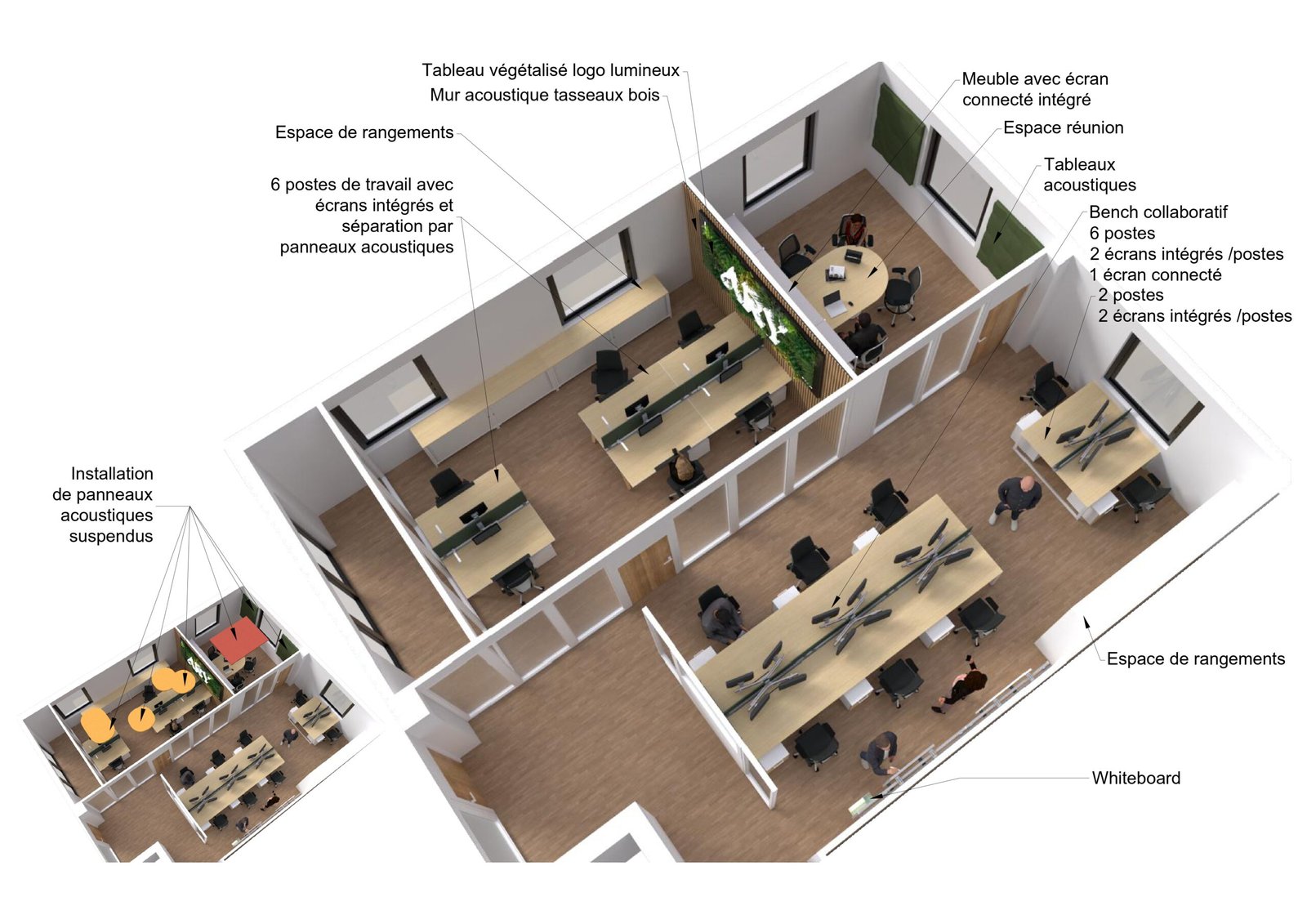 Ce projet repense l’aménagement des bureaux pour offrir un cadre de travail moderne et ergonomique. Espaces collaboratifs optimisés, postes de travail intégrés, solutions acoustiques et design soigné assurent confort et productivité. Une transformation pensée pour allier bien-être et performance au quotidien.
