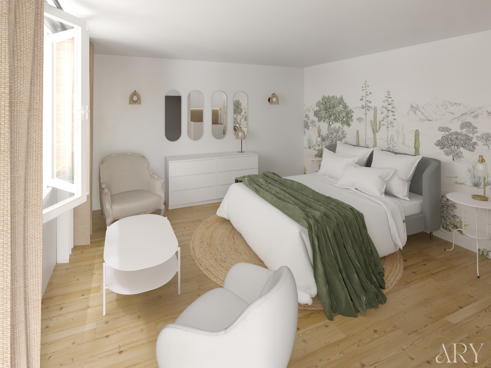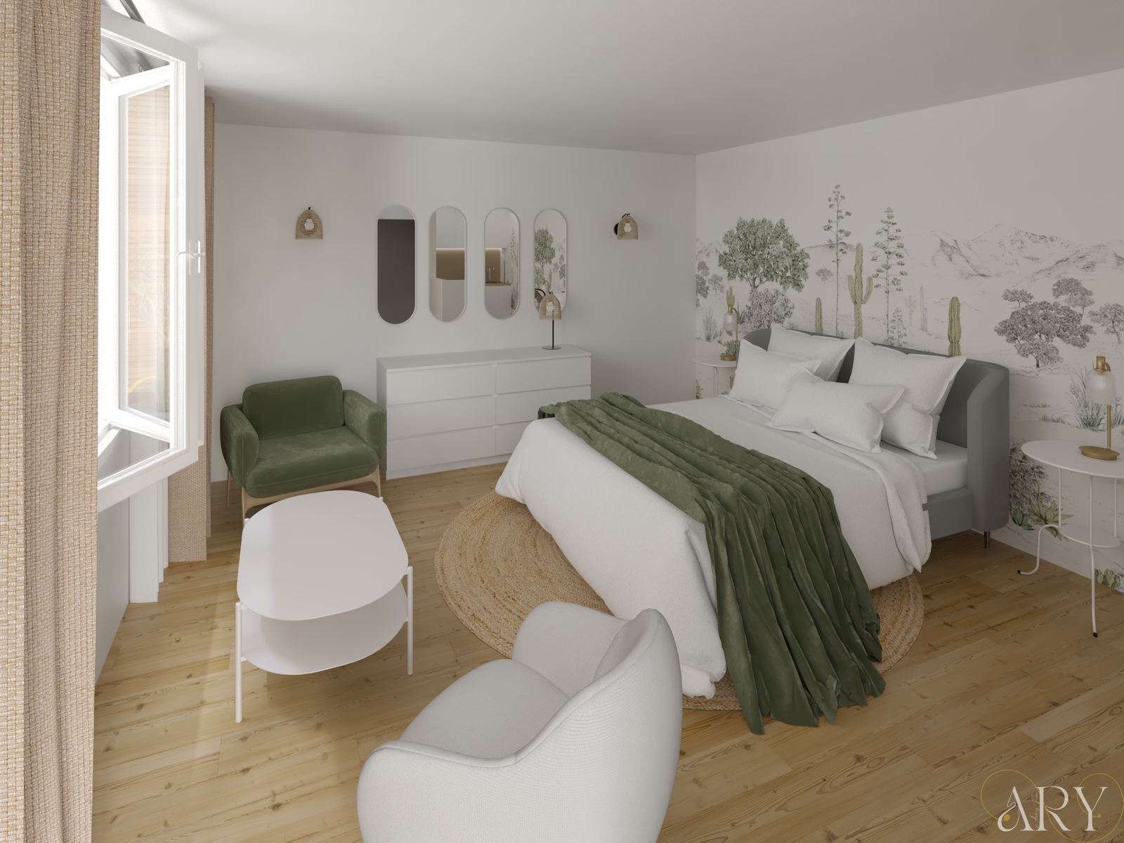 Version naturelle et apaisante : Un écrin de douceur où les teintes organiques dominent. Des nuances beiges, des matières chaleureuses comme le bois et des textiles en fibres naturelles apportent une atmosphère relaxante et lumineuse. Idéal pour ceux qui recherchent un cadre de vie zen et intemporel.