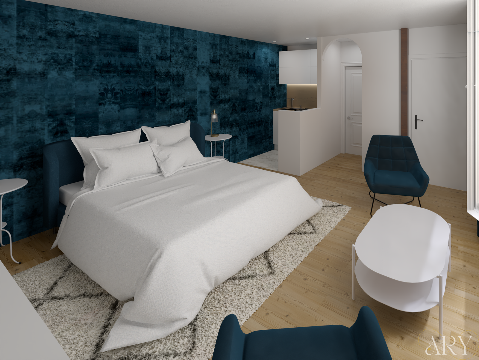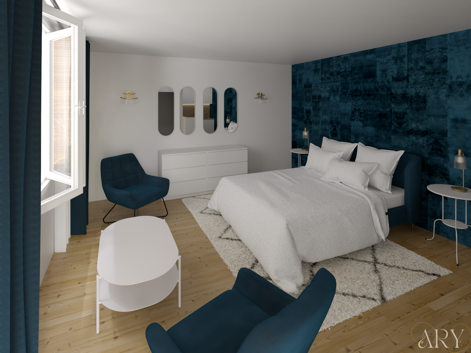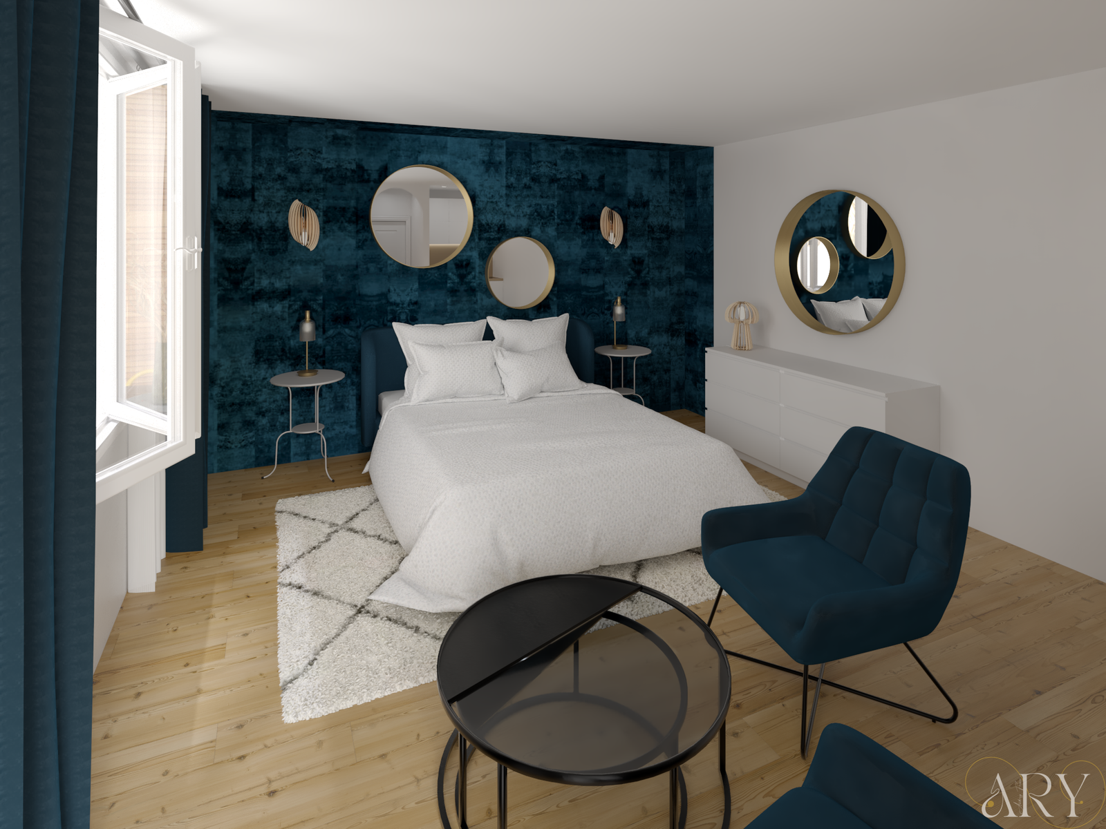 Version raffinée et audacieuse : Une scénographie plus marquée avec des tons profonds et des matières luxueuses. Velours bleu nuit, contrastes élégants et touches dorées créent un univers sophistiqué, évoquant le raffinement des grands hôtels parisiens.